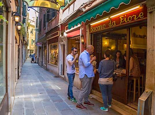 | But if all you want is a drink and some nibbles then head to an ENOTECA (wine bar) or BIRRERIA (pub) or CANTINA (wine bar with its own cellar). In Venice, of course, you head to a BACARI where you can find good wine and wonderful cicchetti (finger foods) of many local, freshly made varieties you buy by the piece. It is possible to make up a great small meal from some of the scrumptious offerings and it is definitely a Venetian experience you will not want to miss. | ||