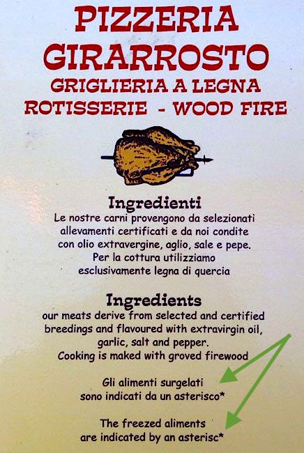 Things to Look Out for Coperto - Cover Charge: This is one thing that often catches the first-timer unawares. It is quite a legitimate per person charge, over any meal or drinks you order and is set to cover the bread or breadsticks that just arrive at the table. The rate varies widely but can be anywhere from €1 or €2 but typically around €2.50. It can be higher in some tourist areas. By law, it must be added to the menu, usually in smaller print at the lower edge. I never mind this cover charge as long as it is not too over the top. Servizio - Service Charge: This one is a further surcharge that can be added, and that I do avoid. You will see it a lot in places like Venice, especially places with great views over a canal but also in high tourist areas close to Piazza San Marco. This can be 12% and up to 15% ON TOP of your final bill. So do check this one. It is also meant to be written clearly on the menu but I do also make a point of asking before entering some places. If you are dining out of high season, meaning they are more concerned to fill tables, you can often convince them to waive this addition. Surgelati - Frozen: All food places in Italy are required by law to inform customers if any part of their dishes includes frozen food. There are stiff fines if they do not comply. Typically, there is a disclaimer added to the menu. Sometimes particular dishes will have an asterisk (*) next to the item in question with an explanation below, such as: “prodotti surgelati”. But you may also come across a sentence attached at the very bottom og the menu that says something like: “alcuni prodotti potrebbero essere surgelati” (some products may be frozen), which usually means that whether dishes are frozen or fresh depends on the season. You can always ask to be sure. The key word to look for is: “surgelati” which means “frozen.” In some cases you may find this acceptable as long as it restricted to some vegetable types but for whole courses or especially fish I do recommend you avoid those items. If the menu is clear and up front, you can always choose another fresh dish. |